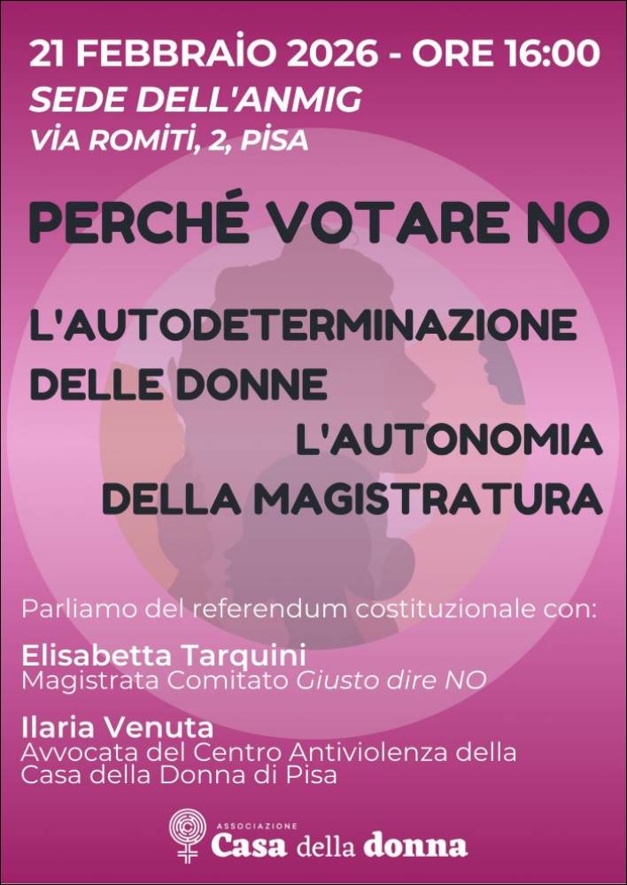 Ne parleremo con Elisabetta Tarquini (Magistrata Comitato Giusto dire NO) e Ilaria Venuta (Avvocata del Centro Antiviolenza della Casa della Donna di Pisa)