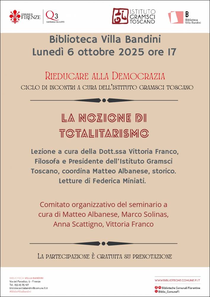 Lunedì 6 ottobre alla Biblioteca di Villa Bandini, via del Paradiso 5, Firenze, si conclude il ciclo "Rieducare alla democrazia", organizzato dall’Istituto Gramsci Toscano.