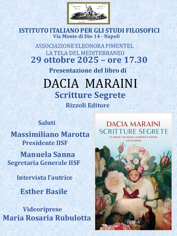 Mercoledì 29 ottobre alle ore 17:30 l'Istituto Italiano per gli Studi Filosofici organizza la presentazione di 'Scritture segrete' , il libro di Dacia Maraini (Rizzoli)In Istituto Filosofico nel Palazzo del ‘700 napoletano Serra di Cassano il 29 ottobre ore 17,30 come ogni anno la presenza di Dacia Maraini ed il suo Libro “Scritture segrete” Ed. Rizzoli, intervistata dalla filosofa e scrittrice Esther Basile. Analisi e percorsi di scrittrici dal 39 A.C. alla contemporaneità, attraversando le mistiche.