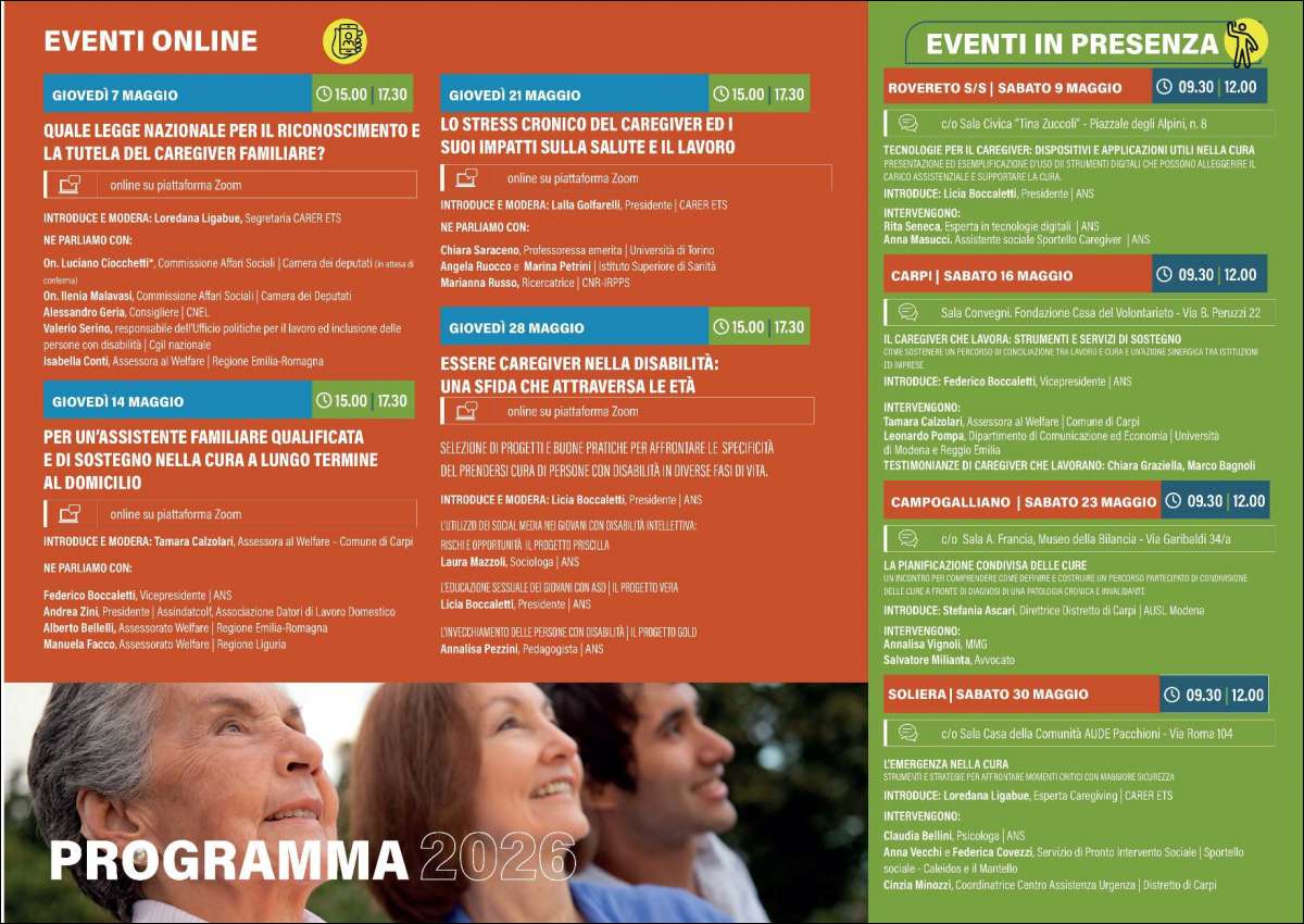 Nel 2026 il Caregiver Day -promosso ed organizzato da Anziani e non solo scs con il sostegno dell’Unione Terre d’Argine ed il patrocinio di CARER Ets Associazione Caregiver Familiari, della Regione Emilia Romagna e dell’AUSL di Modena-si conferma come uno dei principali spazi pubblici di riflessione e confronto sul tema della cura familiare, mettendo al centro chi ogni giorno sostiene persone con disabilità o non autosufficienti, spesso in una condizione di invisibilità sociale.
