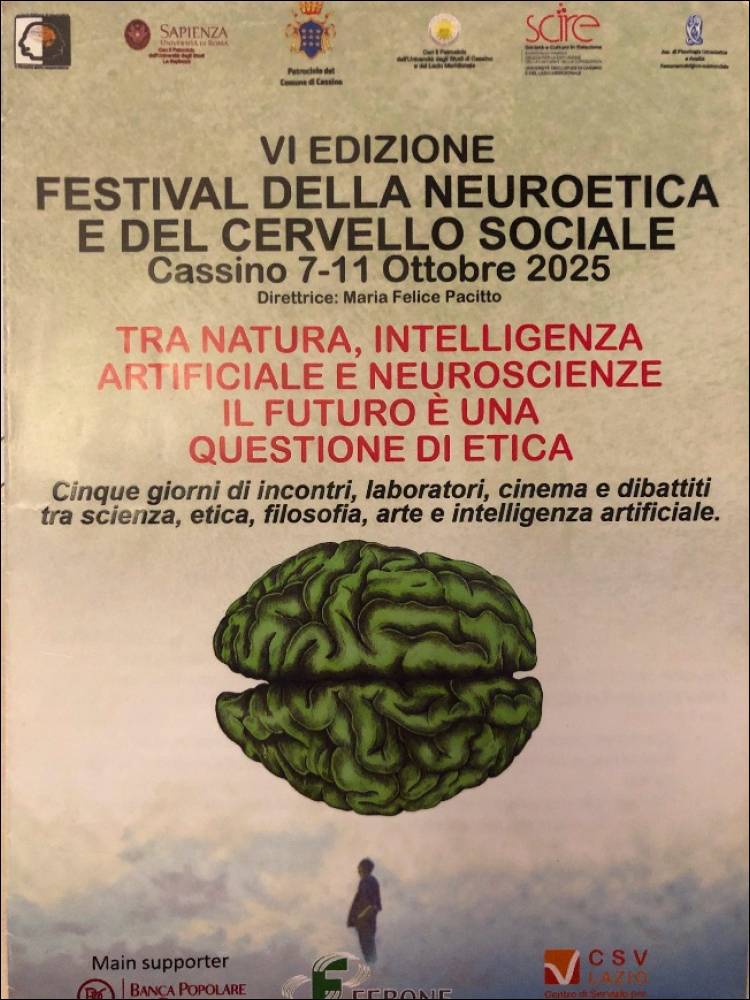 Domenica, 28/09/2025 - Il Festival della neuroetica e del cervello sociale di Cassino è il primo in Italia dedicato ad un contesto multidisciplinare che coniuga scienza ed etica, saperi umanistici e tecnici, filosofia morale e neuroscienze, psicologia e biologia, fino a comprendere ambiti fondamentali della vita umana visto sotto nuova luce.