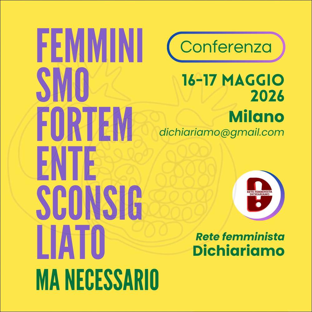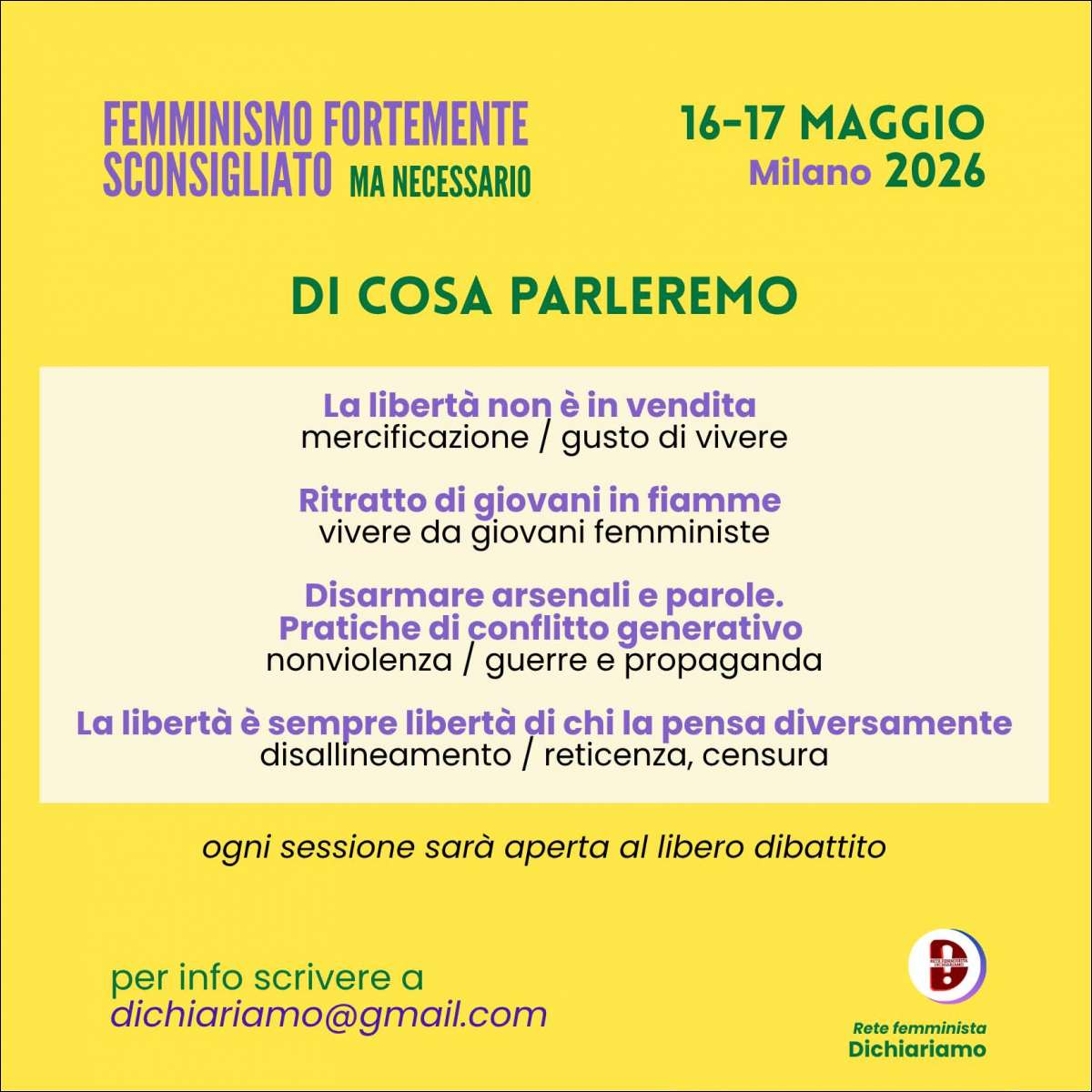 Venerdi, 24/04/2026 - Promosso dalla Rete Dichiariamo, che riunisce singole femministe di generazioni diverse e gruppi e associazioni locali e nazionali, l’incontro nasce dall’urgenza di creare uno spazio di libero confronto femminista, perché mancano.