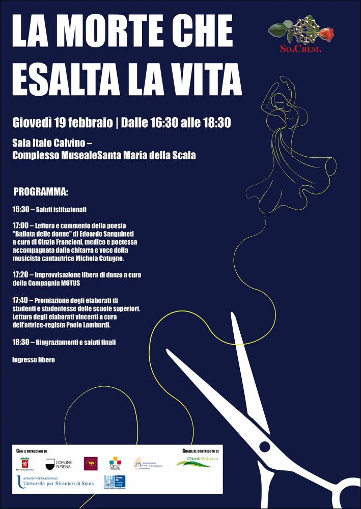 Giovedi, 12/02/2026 - Giovedì 19 febbraio 2026, nella Sala Italo Calvino del Complesso Museale Santa Maria della Scala, si terrà , alle ore 16,30, uno degli appuntamenti centrali del progetto culturale promosso dalla So.CREM Senese per il biennio 2025–2026. L’iniziativa, dal titolo “La morte che esalta la vita”, propone un pomeriggio di arte, parola e movimento dedicato al rapporto tra fine della vita, libertà di scelta e dignità umana, con un’attenzione particolare allo sguardo femminile, da sempre legato ai temi della cura, della memoria e della trasformazione.