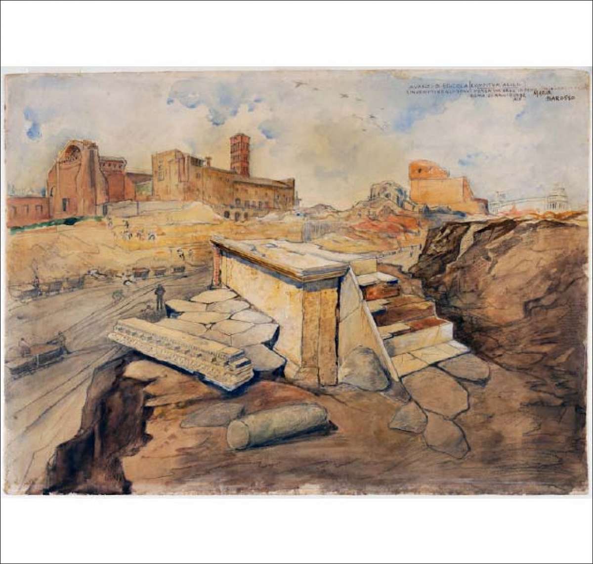 Dalla Basilica di Massenzio all’Area Sacra di largo Argentina, le tavole della Barosso raccontano episodi cruciali: lo sbancamento della Velia, collinetta che collegava Palatino ed Esquilino, eliminata per far spazio alla via dell’Impero (attuale via dei Fori Imperiali) e per creare una scenografia celebrativa paragonata alle grandi imprese ingegneristiche dell’antichità; la sorprendente emersione, tra le macerie di largo Argentina, dei quattro templi repubblicani e della Curia di Pompeo, il luogo dove Giulio Cesare trovò la morte; la demolizione di case e chiese medievali lungo la nuova via del Mare, che isolò ed esaltò i templi del Foro Boario e del Foro Olitorio.