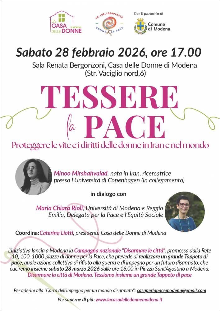 La Casa delle Donne in collaborazione con la Rete 10, 100, 1000 piazze di Donne per la Pace promuove Tessere la Pace. Proteggere le vite e i diritti delle donne iraniane e nel mondo, appuntamento sabato 28 febbraio 2026, ore 17.00