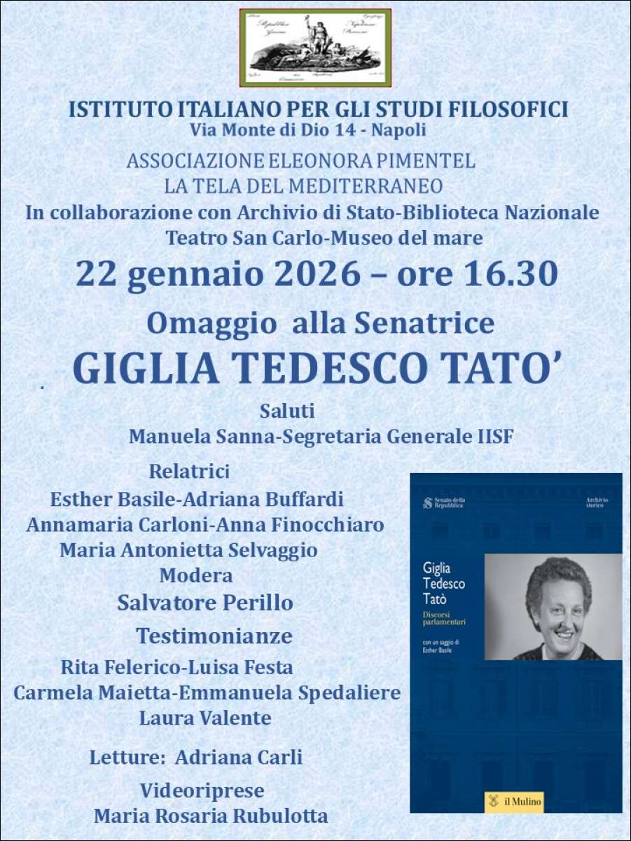 Giovedì 22 gennaio a Palazzo Serra di Cassano di Napoli, sede dell'Istituto Italiano per gli Studi Filosofici, l'Associazione Eleonora Pimentel Lopez De Leon rende omaggio alla donna e alla eminente figura politica
