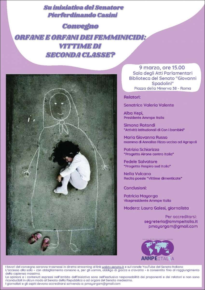 AMMPE ITALIA, sezione italiana dell’Associazione Mondiale delle giornaliste e scrittrici (AMMPE WORLD), ha organizzato il convegno “Orfane e orfani dei femminicidi: vittime di seconda classe?”, che si è tenuto a Roma il 9 marzo presso la biblioteca del Senato della Repubblica alla presenza anche di alcuni parlamentari.