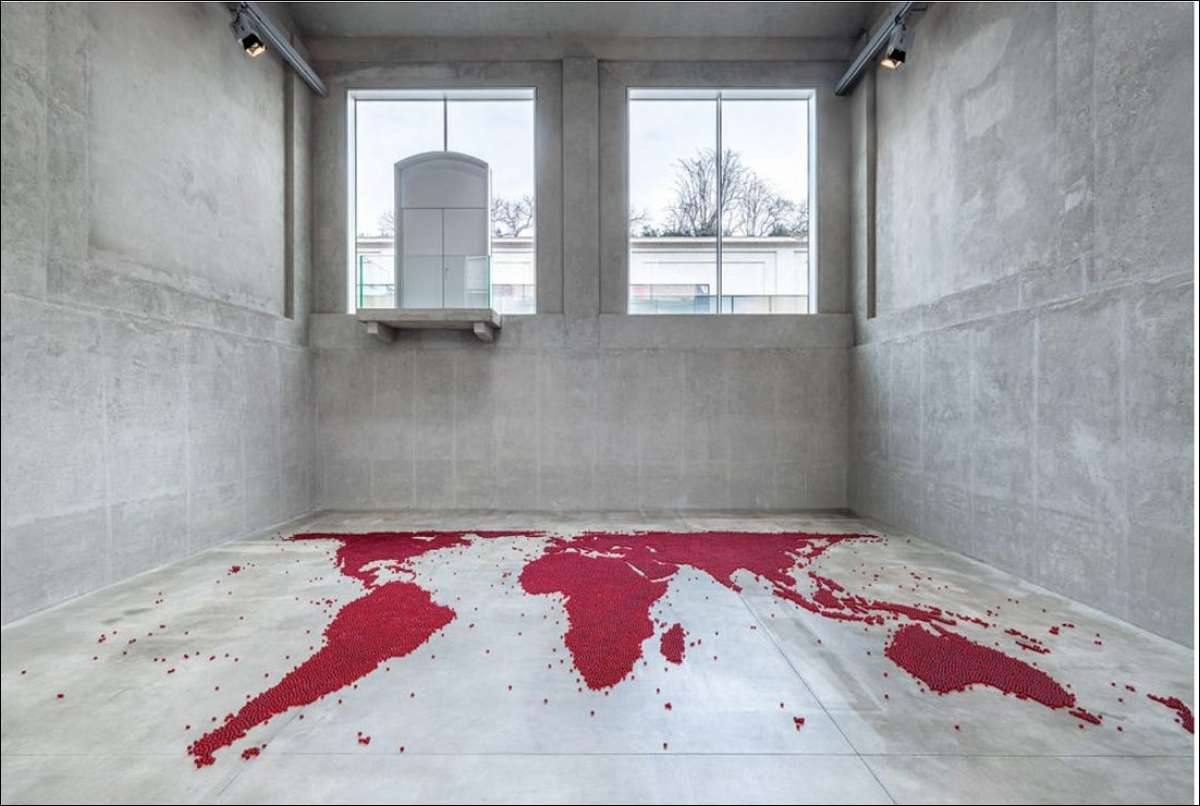 Il pavimento in cemento della sala centrale della Cisterna è ricoperto di sfere traslucide di vetro rosso disposte a formare una cartina del mondo dove sono delineati solamente i contorni dei continenti, ignorando volutamente i confini politici e geografici. Le oltre trentamila sfere rosse, non fissate al pavimento, creano una configurazione instabile descritta dall’artista come “un territorio aperto e indefinito”, potenzialmente soggetto alle forze destabilizzanti provenienti dall’esterno. Come afferma l’architetto e teorico austriaco Theo Deutinger “Un mappamondo non è una mappa. Non è appiattito e pertanto non può essere piegato o arrotolato e messo in tasca. E il mappamondo non ci permette di vedere il pianeta Terra nella sua interezza. Una mappa è come la pelle della Terra, staccata e appiattita”. La visualizzazione del mondo sotto forma di mappa geografica non è del tutto neutrale, poiché storicamente ha incorporato dinamiche di potere politico e rispecchiato sistemi di dominio. Per questo Mona Hatoum ha preso la decisione di utilizzare la proiezione di Gall-Peters e non quella più tradizionale di Mercatore per creare la sua mappa. Questa mappa, infatti, ha corretto le distorsioni delle dimensioni di alcuni territori presenti nella proiezione di Mercatore, che rappresenta le regioni del Sud globale – come l’Africa, il Sud America e il Sud-est asiatico – più piccole della loro reale estensione rispetto al Nord globale.