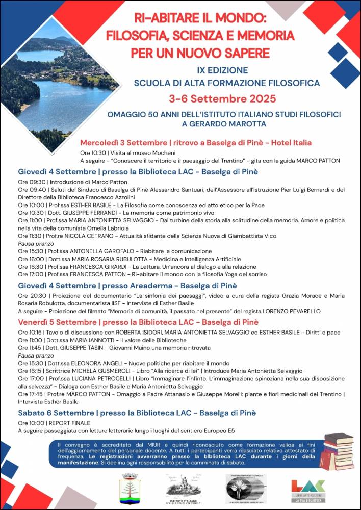 Dal 3 al 6 settembre presso Baselga di Pine’ in Trentino si tiene la nona edizione della Scuola di Alta Formazione Filosofica, evento che incrocia molti linguaggi