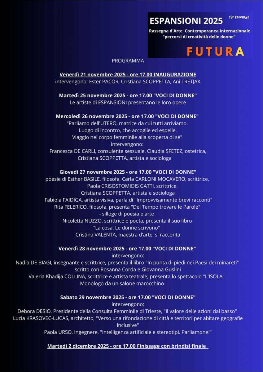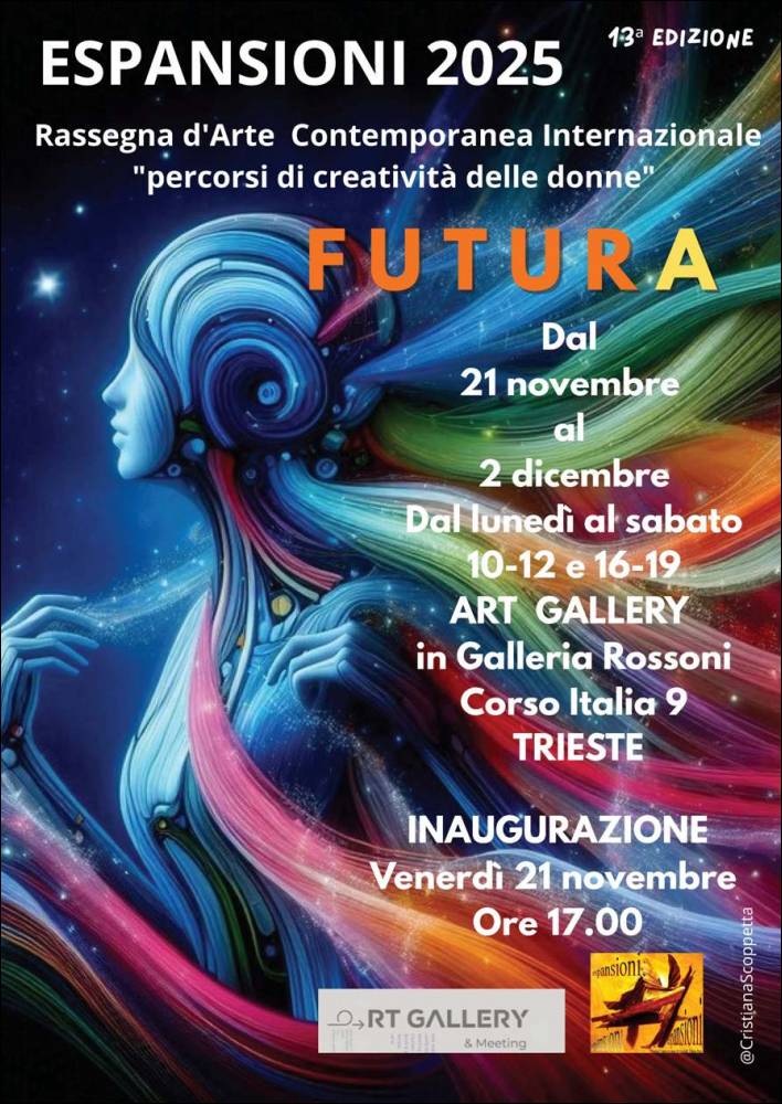 Venerdi, 14/11/2025 - Venerdì 21 novembre 2025 alle ore 17 all'Art Gallery (Galleria Rossoni) a Trieste, Corso Italia, 9 s'inaugurerà la tredicesima Edizione di ESPANSIONI la Rassegna d'Arte Contemporanea Internazionale "percorsi di creatività delle donne".