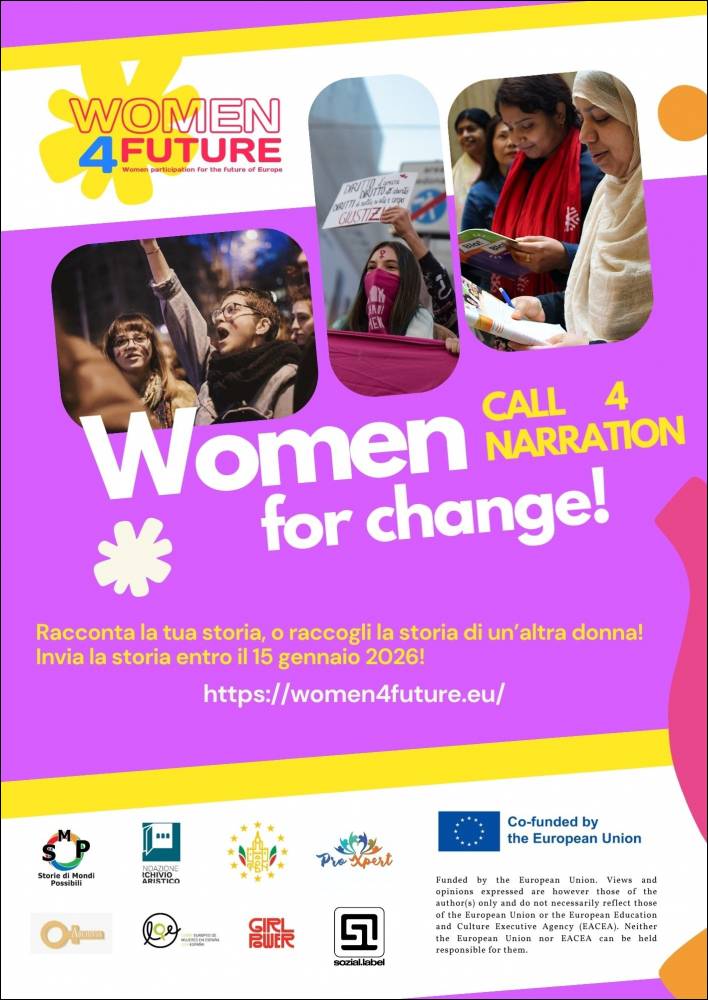 Le autrici e gli autori della Call 4 Narration saranno invitate/i a prendere parte all’ultimo evento del progetto Women4Future che si terrà a Roma il 2 e 3 Marzo 2026.
