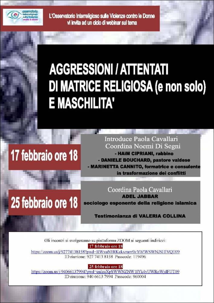L'Osservatorio interreligioso sulle Violenze contro le Donne invita a un ciclo di webinar 17 e 25 febbraio 2021