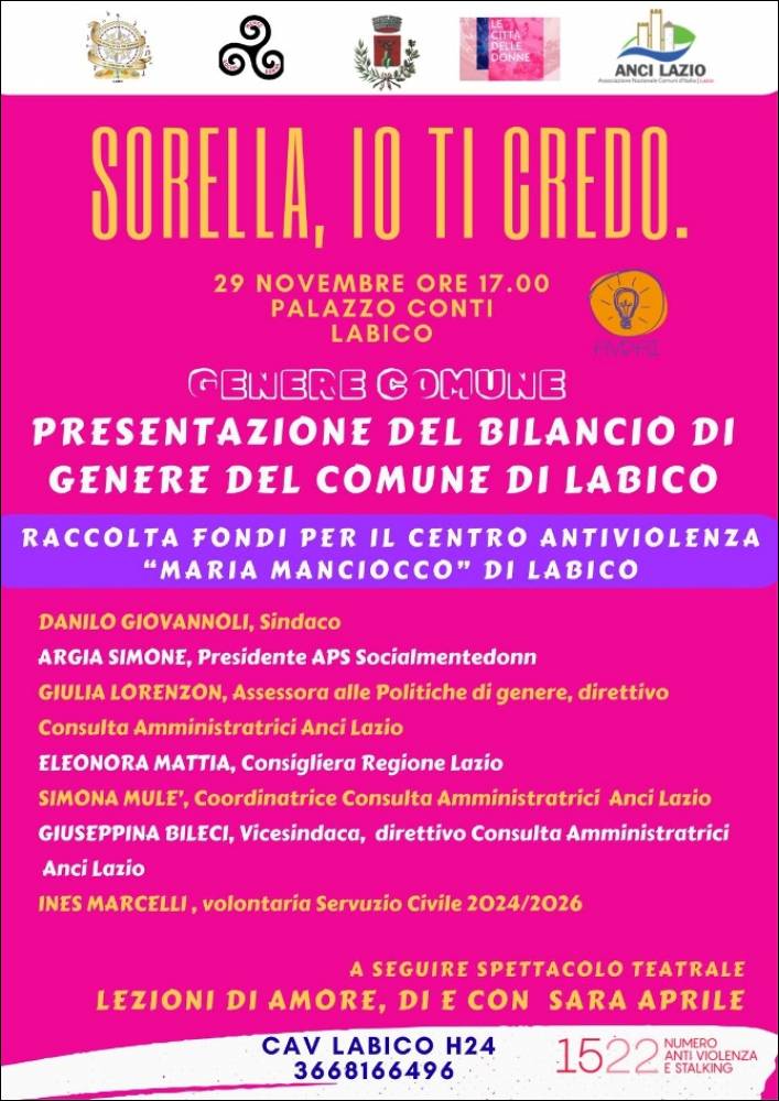 Sorella, io ti credo' è il titolo dell'incontro che si tiene Sabato 29 novembre alle ore 17:00 presso Palazzo Conti per la presentazione del Bilancio di genre del Comune di Labico.