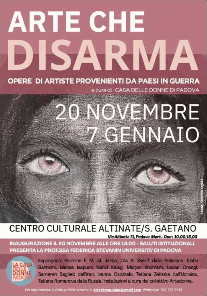 Nella stagione di crudeltà disumana che sta attraversando il pianeta, all’interno del collettivo Artedonna abbiamo condiviso il senso di orrore e d’impotenza che sta toccando ognuna e ognuno di noi. Abbiamo pensato che l’arte potesse rappresentare un palcoscenico dove manifestare la resistenza di chi non vuole rassegnarsi a un destino di guerra e di violenza e stiamo quindi lavorando da alcuni mesi all’organizzazione di un’esposizione di opere di artiste provenienti da alcuni dei paesi in guerra. L’intenzione è quella di ribadire che il genere femminile, preposto a creare la vita attraverso il proprio corpo, desidera stare lontano dalla follia omicida che periodicamente attraversa i popoli distruggendo esistenze, abitazioni, aziende e intere economie. Lontano dagli istinti predatori e di sopraffazione che generano le guerre. Le donne, ne siamo convinte, insieme ai tanti uomini non violenti, saranno il motore di un possibile cambiamento epocale. Con questa mostra vogliamo dare il nostro piccolo contributo a questa visione.