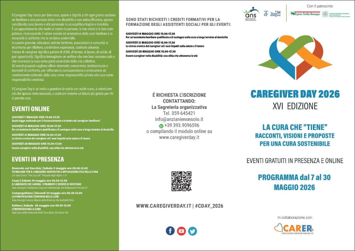 Nel 2026 il Caregiver Day -promosso ed organizzato da Anziani e non solo scs con il sostegno dell’Unione Terre d’Argine ed il patrocinio di CARER Ets Associazione Caregiver Familiari, della Regione Emilia Romagna e dell’AUSL di Modena-si conferma come uno dei principali spazi pubblici di riflessione e confronto sul tema della cura familiare, mettendo al centro chi ogni giorno sostiene persone con disabilità o non autosufficienti, spesso in una condizione di invisibilità sociale.