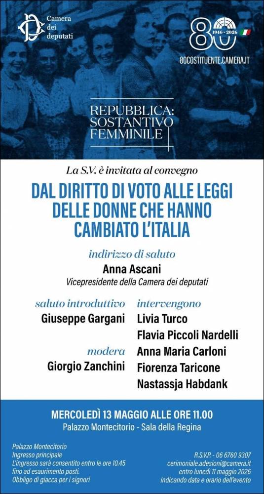 Per partecipare al convegno, è necessario registrarsi, scrivendo a cerimoniale.adesioni@camera.it entro lunedì 11 maggio 2026, indicando data e orario dell'evento. (Vedere la locandina).