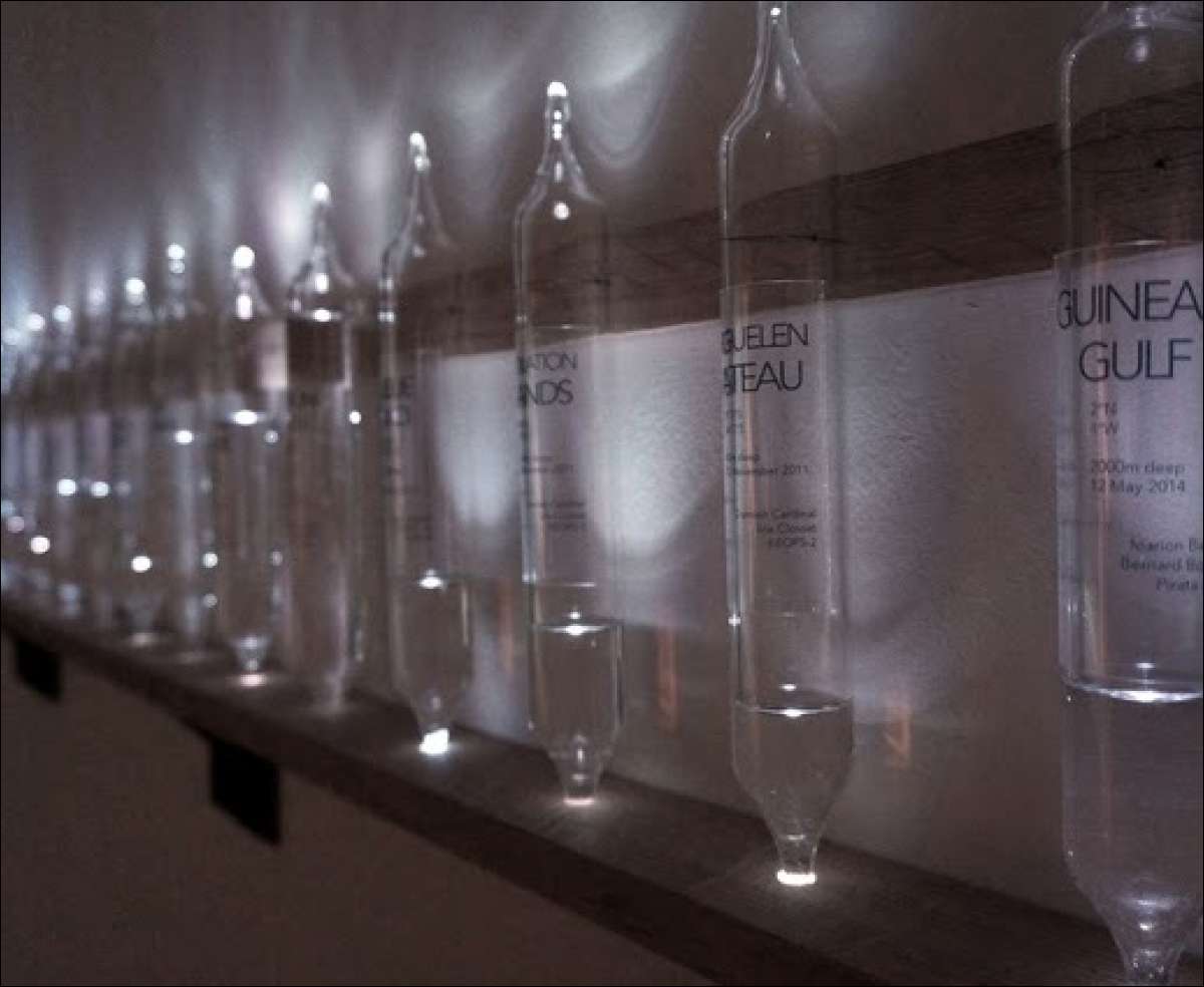Memory of the ocean, 2014 21 fiale in vetro (h17x4 cm), mensola doppia (240x10 cm) con led incorporato, 12 fiale in vetro (dimensioni variabili), mensola (120x10 cm) con led incorporato, mappa retroilluminata (120x70 cm), monitor, audio Il tempo è un concetto su cui l’umanità s’interroga dai tempi atavici. In particolare la percezione del tempo rappresenta un interrogativo costante nella storia della nostra società. L’artista ci propone una riflessione diversa, che deborda interamente dalla prerogativa dell’essere umano sulla concezione del tempo. Anaïs Tondeur ci presenta un’altra prospettiva, ossia la percezione attraverso i cicli temporali degli oceani. La sua ricerca si basa su trentatré campioni di acqua oceanica, raccolti lungo la circolazione termoalina. Tale movimento collega tutti gli oceani del pianeta da circa 1500 anni. Le acque che costituiscono l’installazione sono state raccolte a diverse profondità, partendo dalla superficie per arrivare fino a una profondità di 8.000 metri.