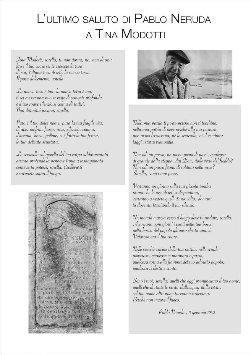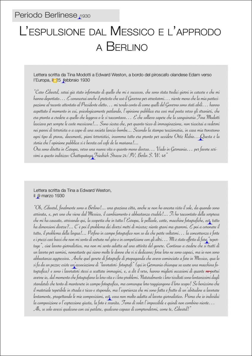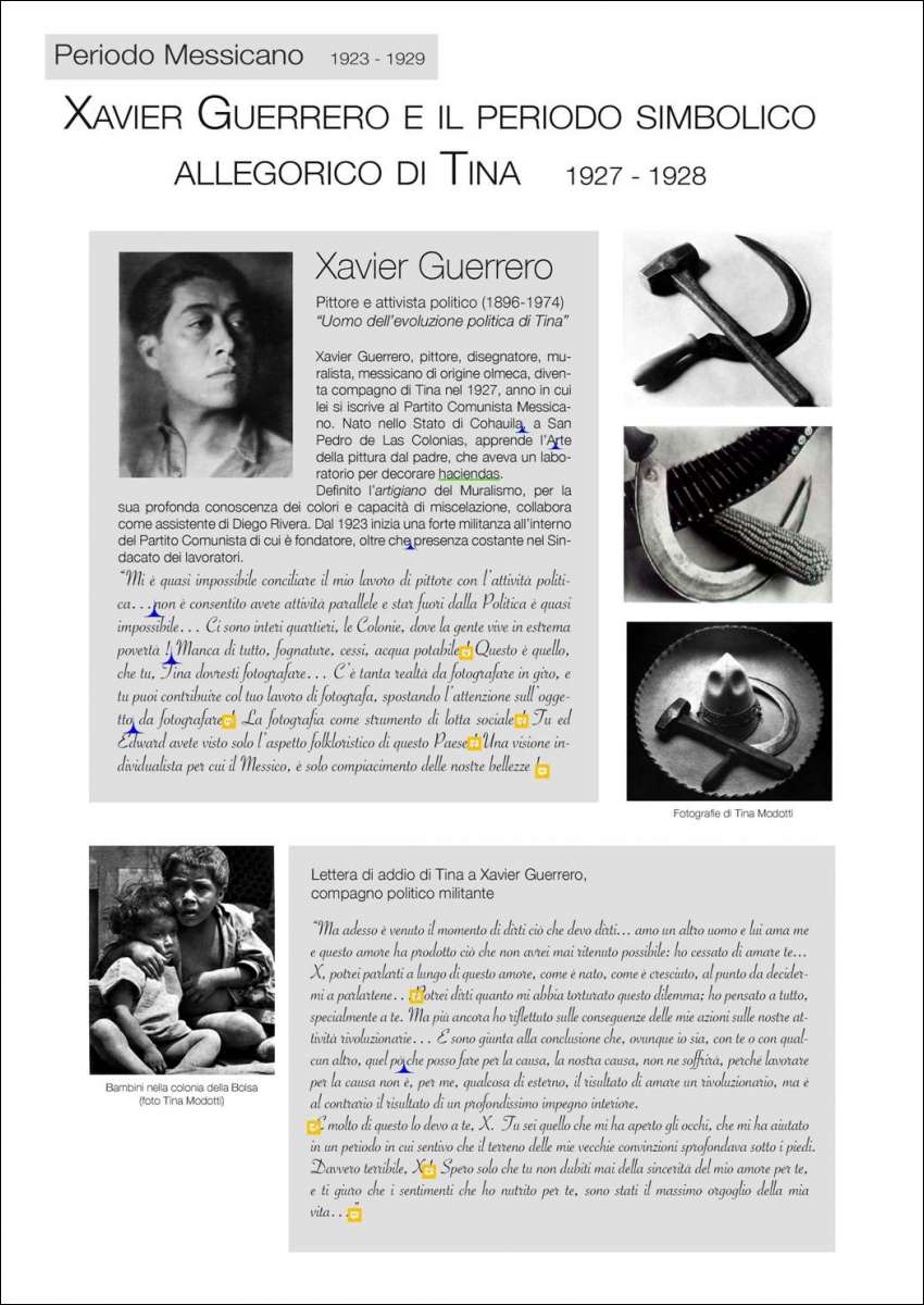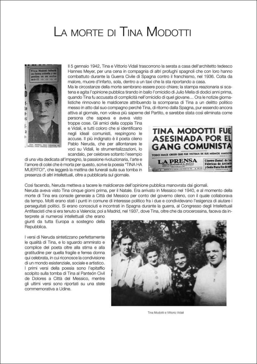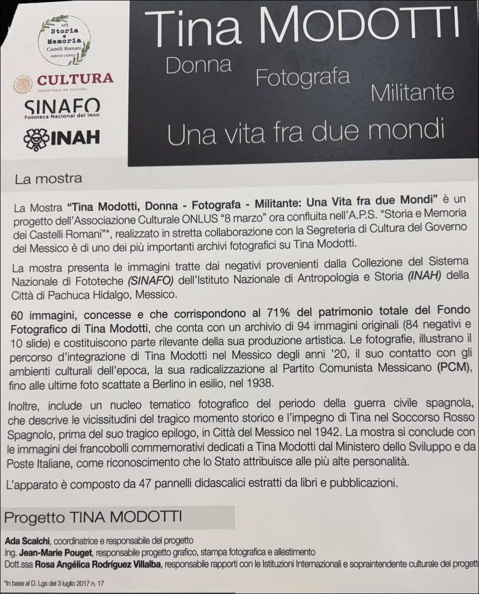Completano la mostra anche numerosi documenti che contribuiscono a illustrare le vicende umane e politiche di Tina Modotti dell’ultima fase, quale componente del Partito Comunista, nonché Dirigente delle Brigate Internazionali del Soccorso Rosso, fino alla morte, avvenuta a Città del Messico nel 1942 a soli 45 anni.