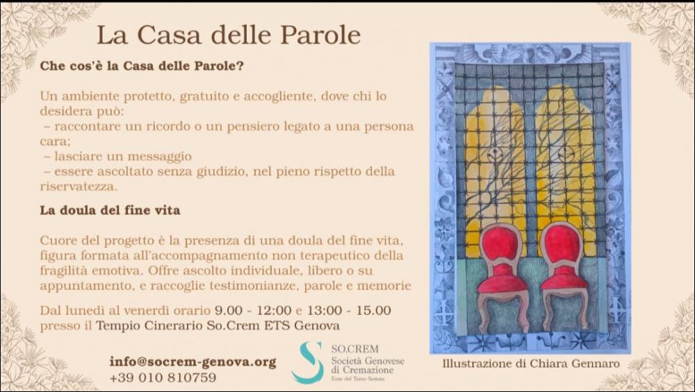 Sabato, 29/11/2025 - C’è un gesto antico, semplice e disarmante, che precede ogni ritualità funebre: qualcuno che ascolta. Non un ascolto tecnico, non una spiegazione, non un conforto imposto, ma la disponibilità silenziosa a farsi attraversare dal racconto di chi ha perso una persona amata. È da questa intuizione nasce La Casa delle Parole, il nuovo progetto So.Crem che è stato inaugurato domenica 30 novembre, all’interno del Tempio Crematorio del Cimitero Monumentale di Staglieno.