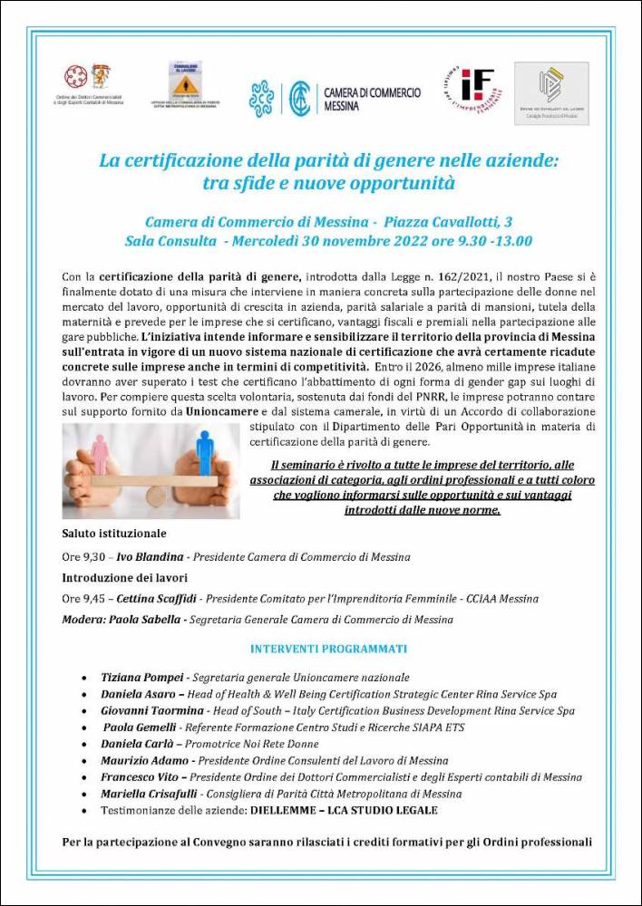 Con la certificazione della parità di genere, introdotta dalla Legge n. 162/2021, il nostro Paese si è finalmente dotato di una misura che interviene in maniera concreta sulla partecipazione delle donne nel mercato del lavoro, opportunità di crescita in azienda, parità salariale a parità di mansioni, tutela della maternità e prevede per le imprese che si certificano, vantaggi fiscali e premiali nella partecipazione alle gare pubbliche. L’iniziativa intende informare e sensibilizzare il territorio della provincia di Messina sull’entrata in vigore di un nuovo sistema nazionale di certificazione che avrà certamente ricadute concrete sulle imprese anche in termini di competitività. Entro il 2026, almeno mille imprese italiane dovranno aver superato i test che certificano l’abbattimento di ogni forma di gender gap sui luoghi di lavoro. Per compiere questa scelta volontaria, sostenuta dai fondi del PNRR, le imprese potranno contare sul supporto fornito da Unioncamere e dal sistema camerale, in virtù di un Accordo di collaborazione stipulato con il Dipartimento delle Pari Opportunità in materia di certificazione della parità di genere. Il seminario è rivolto a tutte le imprese del territorio, alle associazioni di categoria, agli ordini professionali e a tutti coloro che vogliono informarsi sulle opportunità e sui vantaggi introdotti dalle nuove norme.