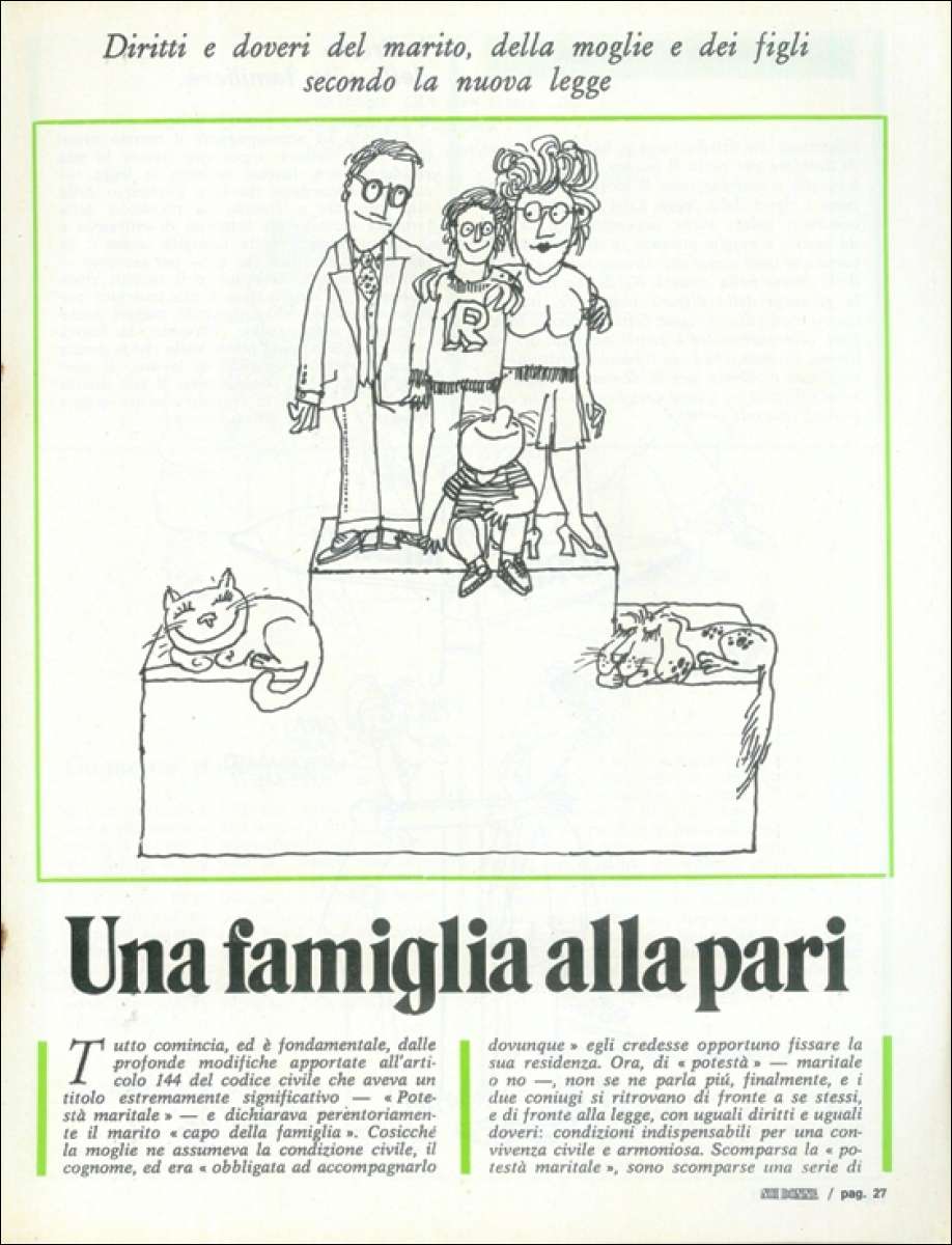 “La battaglia per il nuovo diritto di famiglia teneva insieme tanti aspetti che toccavano sia la vita concreta delle donne che il quadro dei diritti soggettivi e portava con se la forza dirompente di una rottura del rapporto tra le donne e la famiglia che risaliva ad uno schema patriarcale di lungo corso ma che il fascismo aveva rafforzato come ‘destino’ delle donne quali mogli sottomesse all’autorità maritale, autorità a cui erano sottoposti anche i figli, un autoritarismo di base che serviva a sostenere altri tipi di autoritarismo pubblico. Accanto al riconoscimento della parità tra uomo e donna dentro la famiglia anche nei confronti delle responsabilità genitoriali verso i figli forse il dato più rivoluzionario che la riforma conteneva era quello economico: il riconoscimento del valore economico del lavoro delle donne, sia quando questo si esercitava nel contesto di imprese familiari sia quando si trattava del lavoro familiare e casalingo. Premessa della svolta che la legge aprì sul piano dei diritti economici delle donne, sanciti non solo sul piano formale paritario della condivisione di responsabilità in ruoli e attività svolte in ambito familiare ma che trovava finalmente concretezza nel principio della comunione dei beni. Un principio che ha fornito alle donne negli anni successivi strumenti basilari di tutela economica rispetto a contenziosi familiari. Ma uno dei capitoli più rivoluzionari della riforma riguarda anche il riconoscimento della parità tra figli nati dentro e figli nati fuori dal matrimonio. Non si può capire oggi l’importanza della cosa se non si ricordasse la drammaticità e l’ampiezza del fenomeno dei tantissimi bambini illegittimi, senza diritti certi e di conseguenza quella delle loro madri, colpevolizzate, senza diritti sociali ed economici per il sostegno dei loro figli”.