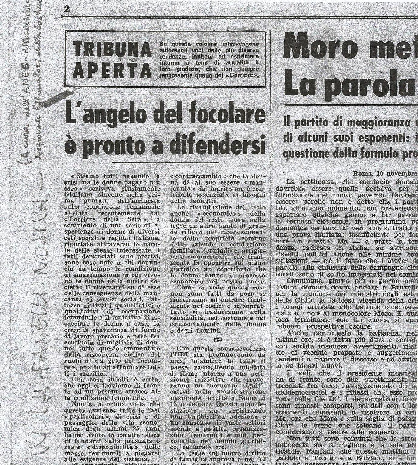“È utile ricordare il contesto sociale e politico di quel periodo per capire tutta l’importanza di un approdo legislativo, così innovativo e articolato insieme, quale è stato quello della legge 151 del 1975. Nel 1974 io ero impegnata nell’UDI (Unione Donne Italiane), una delle organizzazioni più attive in quegli anni su tanti terreni che riguardavano aspetti concreti e legislativi della condizione delle donne. Come cattolica di sinistra ero stata molto attiva nel Comitato del NO per difendere la legge sul divorzio dagli attacchi clericali e conservatori. Del nuovo diritto di famiglia, in realtà, si parlava da tempo sia all’interno delle forze politiche e parlamentari che soprattutto da parte dei movimenti delle donne. Si era costruito una sorta di alleanza trasversale tra donne dei movimenti femminili e donne appartenenti a partiti diversi: cattoliche, comuniste,socialiste, repubblicane. Una spinta che contribuì moltissimo a tracciare i contorni e i contenuti quali furono poi codificati nella legge. Infatti già nel 1972 fu approvato un testo alla Camera dei deputati con il consenso unitario di tutte le forze democratiche, ma la dura battaglia referendaria per il divorzio e il contrattacco conservatore di fatto produsse un blocco di quell’iter. Il divorzio passò alla grande e anche per questo si riattivarono molti tentativi per colpire o annacquare parti importanti della riforma del diritto di famiglia. Divorzio e diritto di famiglia, quindi, hanno non a caso un intreccio profondo. Di fronte alle resistenze dei settori conservatori si riaccese la mobilitazione delle donne. Si raccolsero migliaia di firme, si andò in piazza. In quel contesto, nel novembre 1974 l’UDI mi chiese di scrivere un articolo che doveva essere ospitato in uno spazio di Tribuna Libera su Il Corriere della Sera, che fu pubblicato con il titolo ‘L’angelo del focolare è pronto a difendersi’. Rileggendo oggi quell’articolo, conservato nel mio archivio personale insieme a tanti altri documenti del periodo, mi colpisce l’attualità di alcune cose che ancora sono valide oggi. Intanto la lettura delle condizioni difficili delle donne ad affermare una vera parità nel mercato del lavoro e nella società. Diseguaglianze imputate non solo all’interesse a mantenere le donne in posizioni marginali nei processi economici di ampi settori produttivi ma ‘per confermare e consolidare una visione della donna proiettata nella famiglia, eterna supplente di servizi sociali che non ci sono.. Questa visione di coniuge debole riproposta durante il referendum non è stata sconfitta e rischia di ritrovare nelle oggettive difficoltà di ordine economico e sociale una stampella per riproporsi a trovare spazio nell’opinione pubblica”…Di fronte a questo sottolineavo che “ le forze che intendono battersi per realizzare una effettiva emancipazione non possono che partire dal presupposto che non è possibile più scindere gli aspetti cosiddetti strutturali della condizione delle donne da quelli cosiddetti sovrastrutturali cioè di quelli che fanno in termini soggettivi della donna un essere con un ruolo già precostituito’. Queste mie riflessioni che rispecchiavano quello che muoveva dal profondo l’iniziativa di tante donne esprimono bene cosa c’era dietro alla consapevolezza che la conquista del nuovo diritto di famiglia rappresentava. Non era una semplice legge”.