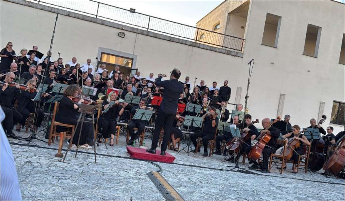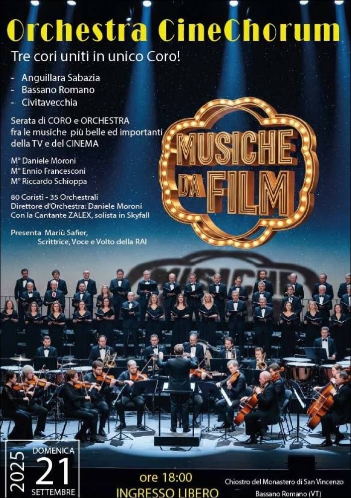 Lunedi, 22/09/2025 - Bassano Romano, 21 Settembre ore 18:00, nel chiostro del Monastero di San Vincenzo Martire è ospitata la serata di Coro e Orchestra, tra le musiche da film più belle dei nostri ricordi, con 80 coristi, 35 orchestrali, con il M° direttore, Daniele Moroni, da uno stile vibrante che trapela tutta la sua profonda interiorità ed i Maestri Ennio Francesconi del coro di Bassano Romano, Riccardo Schioppa della Filarmonica di Civitavecchia, anche pianista e stasera entrambi preparatori dei cori. L’originale esibizione di diversi solisti tra i fiati e voci già note e nuove come il tenore coreano del Teatro dell’Opera di Roma, Yoosang Yonn, apparso come sorpresa finale, con “Nessun dorma” della Turandot di Giacomo Puccini e la giovane cantante aretina Valentina Gialli, in arte, Zalex. La serata è presentata dalla raffinatissima scrittrice e volto televisivo, Mariù Safier, che introduce dolcemente il pubblico all’ascolto.