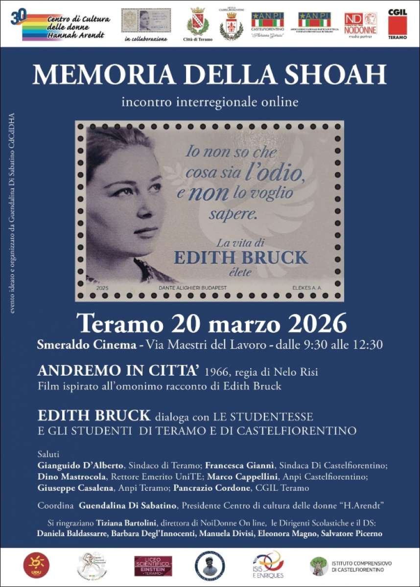 Mercoledi, 18/03/2026 - Il Centro di cultura delle donne “H. Arendt”, impegnato con la Scrittrice, poeta, regista e sceneggiatrice Edith Bruck a mantenere viva la Memoria della Shoah, organizza un incontro virtuale interregionale con le Scuole secondarie di primo e secondo grado di Teramo e di Castelfiorentino.