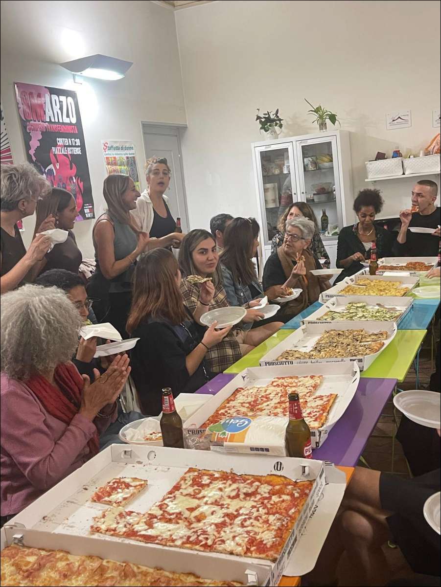 L’arrivo delle pizze è salutato con un grande applauso. Come mi dirà la presidente della cooperativa Valentina Fabbri  (vedi videointervista) al momento sono quasi 18 le donne ospitate ma sono previsti altri arrivi in corrispondenza alla capienza della Foresteria. Gli scambi e i racconti diventano sempre più vivaci. Ci si comincia anche a conoscere tra donne ospiti e donne della Casa. La coordinatrice Alessandra Massaro sollecitata da tutte esprime la sua soddisfazione sulla esperienza che si sta facendo. Si parla anche di nuovi progetti come quello di impiantare una sartoria sociale , progetto che si sta studiando con la collaborazione di alcune associazioni della Casa. Poi a poco a poco, finite le pizze e le birre, l’incontro si scioglie con grandi saluti e con l’impegno di ripetere questi momenti.