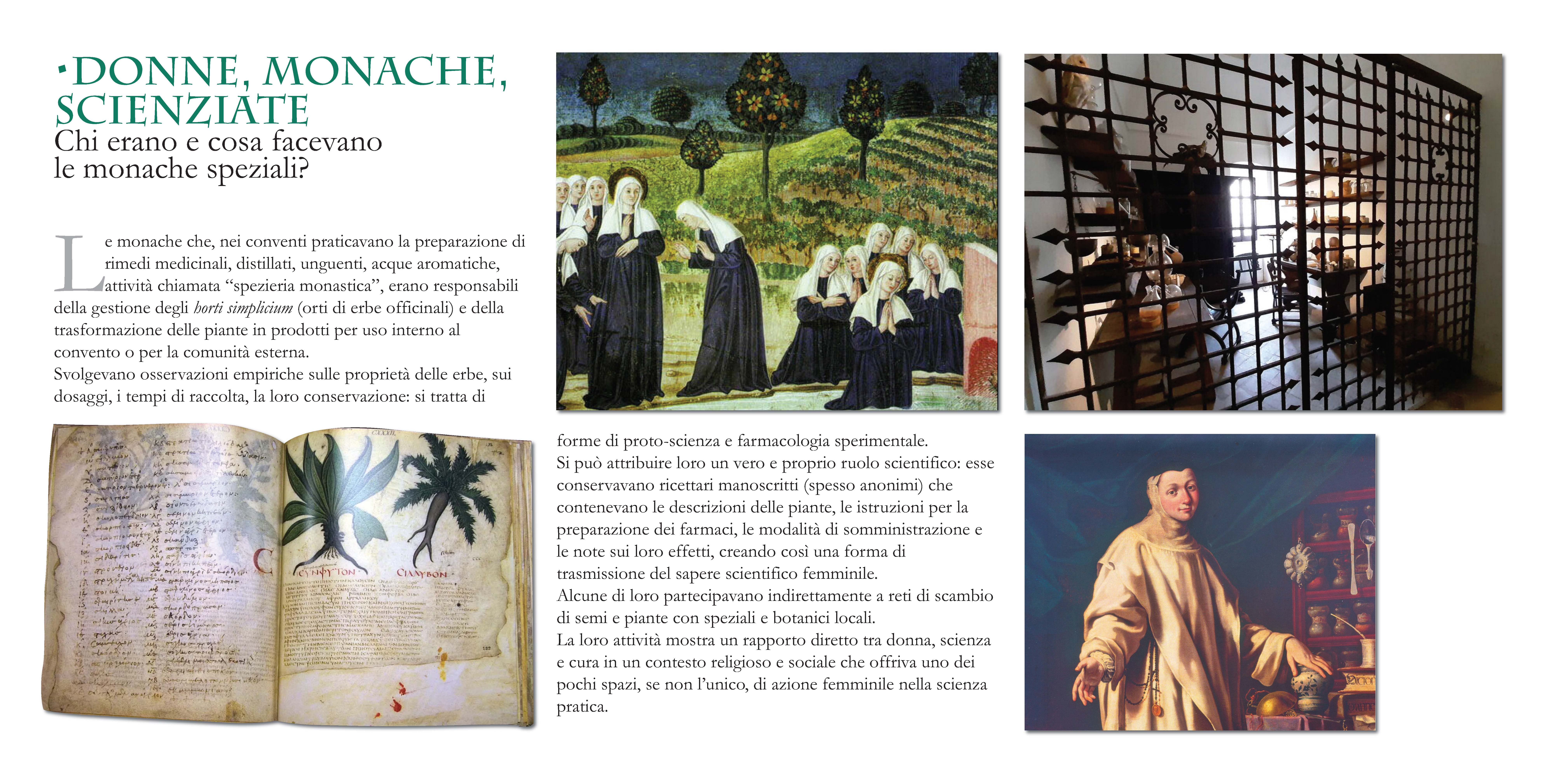 La mostra ricostruisce questi percorsi attraverso pannelli che illustrano gli horti conclusi, le ricette, gli erbari miniati, i manoscritti di segreti farmaceutici, i registri delle preparazioni e oggetti quali alambicchi, vasi farmaceutici, mortai e così via pari a quelli usati nei conventi.