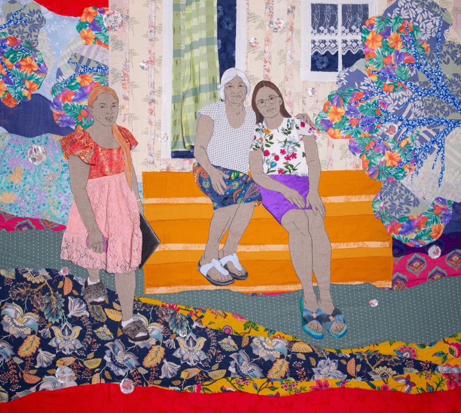 Nel taglio e nell’assemblaggio di materiali di recupero, uniti tramite punti di cucitura che restano visibili, affiora l’esempio di una pratica reale e metaforica di riparazione, di riposizionamento della (e nella) storia, insieme a una empatica inclinazione alla cura di ciò che è considerato marginale.