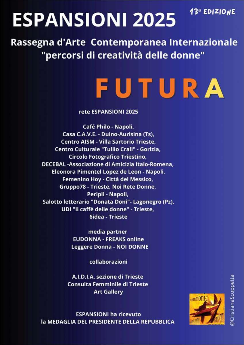 Venerdi, 14/11/2025 - Venerdì 21 novembre 2025 alle ore 17 all'Art Gallery (Galleria Rossoni) a Trieste, Corso Italia, 9 s'inaugurerà la tredicesima Edizione di ESPANSIONI la Rassegna d'Arte Contemporanea Internazionale "percorsi di creatività delle donne".