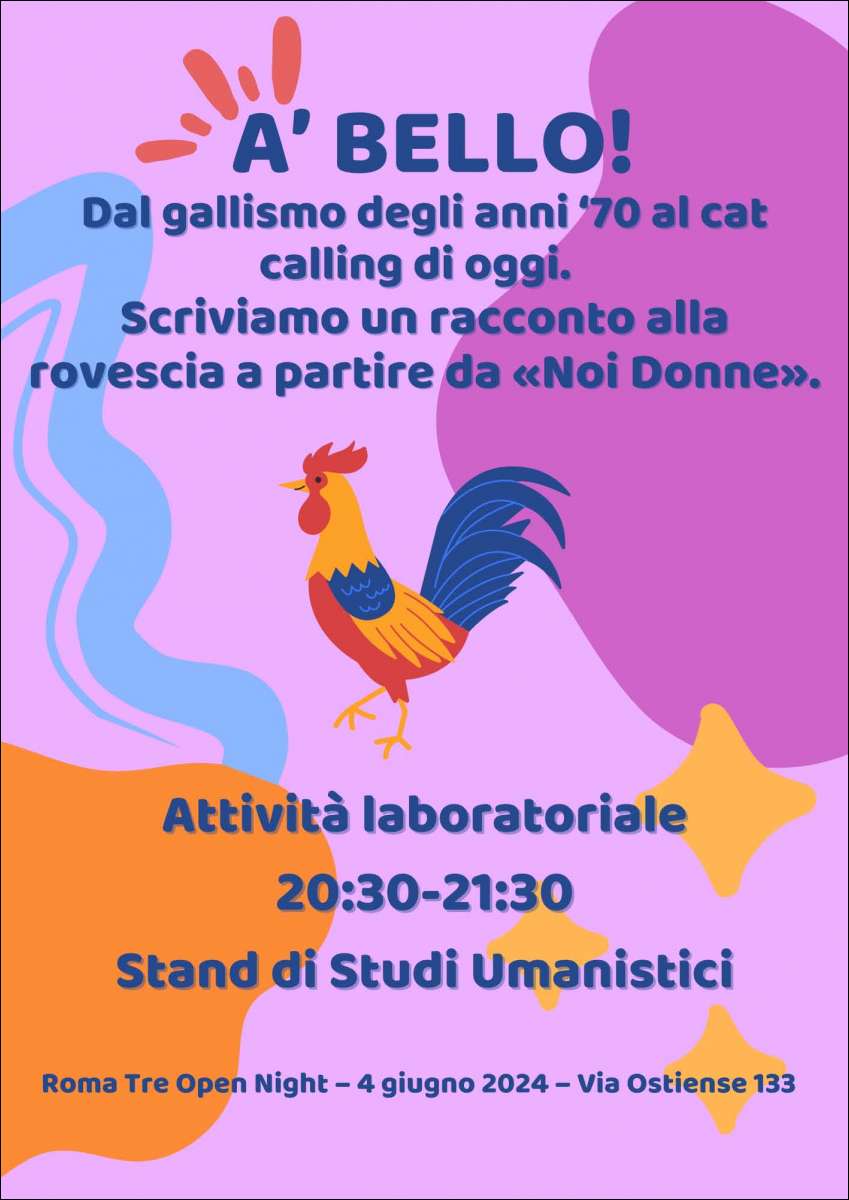 Immaginiamo tre ragazze armate di fogli di carta, penne brandizzate dall’Università e sorrisi a trentadue denti che cercano di rendere accattivante un laboratorio di scrittura dal nome A’ bello! Dal gallismo degli anni ’70 al cat calling di oggi. Scriviamo un racconto alla rovescia a partire da «Noi Donne», lottando contro interessanti esperimenti di fisica, attraenti prototipi di robot e laboratori paleografici promossi dal dipartimento di Lettere classiche.