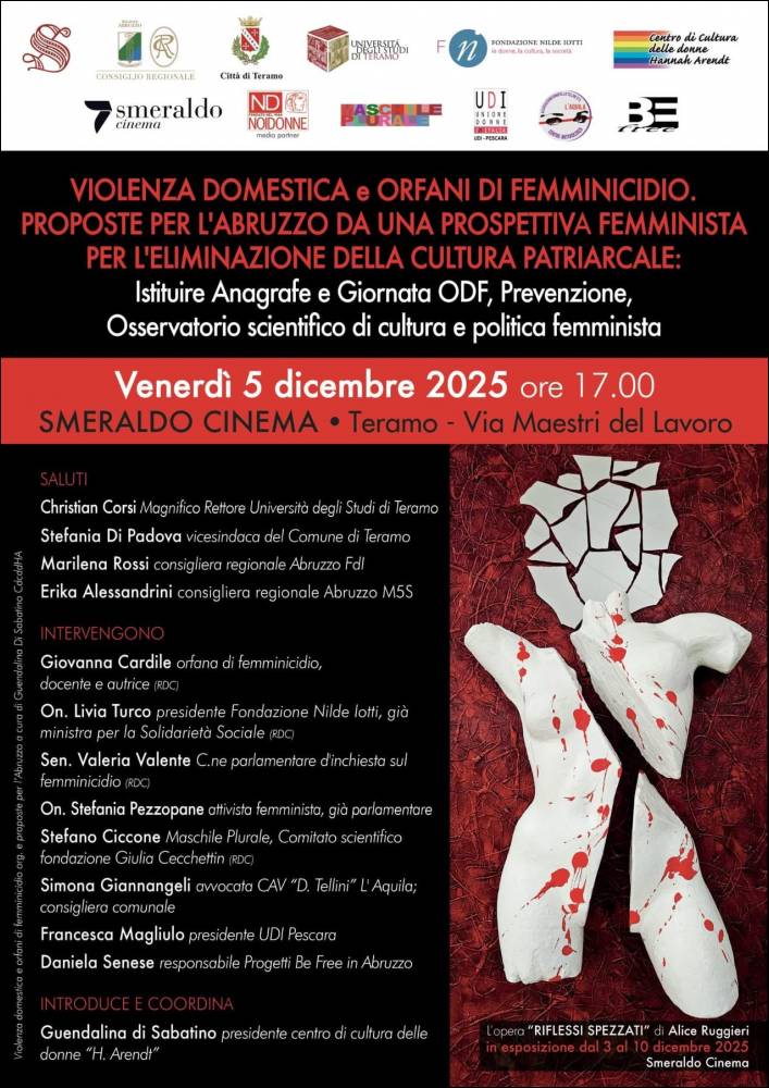 Il Centro di cultura delle donne Hannah Arendt in collaborazione con la Fondazione NILDE IOTTI invita le cittadine e i cittadini all’incontro che si svolgerà il prossimo 5 dicembre alle ore 17 nella Sala 3 di Smeraldo cinema per avviare una riflessione profonda nella società sulla condizione dolorosa degli orfani e delle orfane di femminicidio, colpevolmente rimossa dalla società, che proceda di pari passo con la riflessione sulla violenza domestica, diffusa più di quanto immaginiamo all’interno delle nostre case e che da troppo tempo affligge l’intero territorio nazionale con la nota tragica frequenza: in Italia ogni 72 ore una donna viene uccisa dall’uomo che diceva di amarla, ogni 72 ore figli e figlie che hanno assistito per anni a tante situazioni di sottomissioni e violenza, fisica e psicologica, entrano a far parte della invisibile schiera crescente degli orfani dei crimini domestici. La violenza intrafamiliare è un’emergenza millenaria sommersa e diffusa più di quanto immaginiamo nel silenzio complice dei molti che sanno: vicini, parenti, amici; essa continua ad accadere quotidianamente sulla pelle delle donne e dei loro figli tra le pareti domestiche. Il suo superamento potrà avvenire soltanto attraverso una rivoluzione culturale che non può più attendere e non può prescindere da una prospettiva femminista fondata sulla decostruzione della cultura sessista e patriarcale che ha naturalizzato nei secoli la concezione proprietaria della donna nella gerarchia dei ruoli sessuali, i cui perdenti modelli sociali ed educativi continuano a relegarla nell’inferiorità e a costringere gli uomini nella gabbia opprimente della maschilità dominante. Una rivoluzione culturale trasversale agli schieramenti politici da fare insieme donne e uomini e che nella nostra regione includa imprescindibilmente la presa di parola pubblica delle e degli orfani “speciali”, anche attraverso l’istituzione di una Giornata degli orfani di femminicidio per l’eliminazione della cultura patriarcale e di un’anagrafe (o registro) di questi orfani e orfane. In Italia manca un censimento ufficiale regione per regione. La legge italiana n. 4 del 2018 è tra le migliori d’Europa, tuttavia essa prevede un fondo senza sapere quanti essi siano e di quante risorse c'è bisogno, per questo motivo la sua disponibilità finanziaria è insufficiente oltre ad essere legata ad eccessivi vincoli burocratici. L’istituzione di un’anagrafe (o registro) degli orfani dei crimini domestici in Abruzzo darebbe la possibilità ai privati, e alle aziende che volessero, di fare proprie donazioni direttamente agli orfani maggiorenni meno abbienti o costituire un fondo bancario per il futuro di coloro che sono ancora nella minore età.