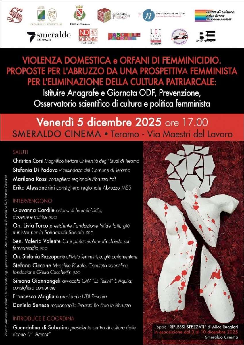 Intervengono: On Livia Turco, presidente della Fondazione NILDE IOTTI, già ministra per la Solidarietà Sociale, Giovanna Cardile, orfana di femminicidio, docente, autrice; Sen Valeria Valente, componente della C.ne parlamentare d'inchiesta sul femminicidio; On. Stefania Pezzopane, attivista femminista, già parlamentare; Stefano Ciccone, Maschile Plurale, Comitato scientifico fondazione Giulia Cecchettin; Simona Giannangeli avvocata Cav D. Tellini L' Aquila,consigliera comunale; Francesca Magliulo, presidente UDI Pescara; Daniela Senese, Responsabile Progetti Be Free in Abruzzo.