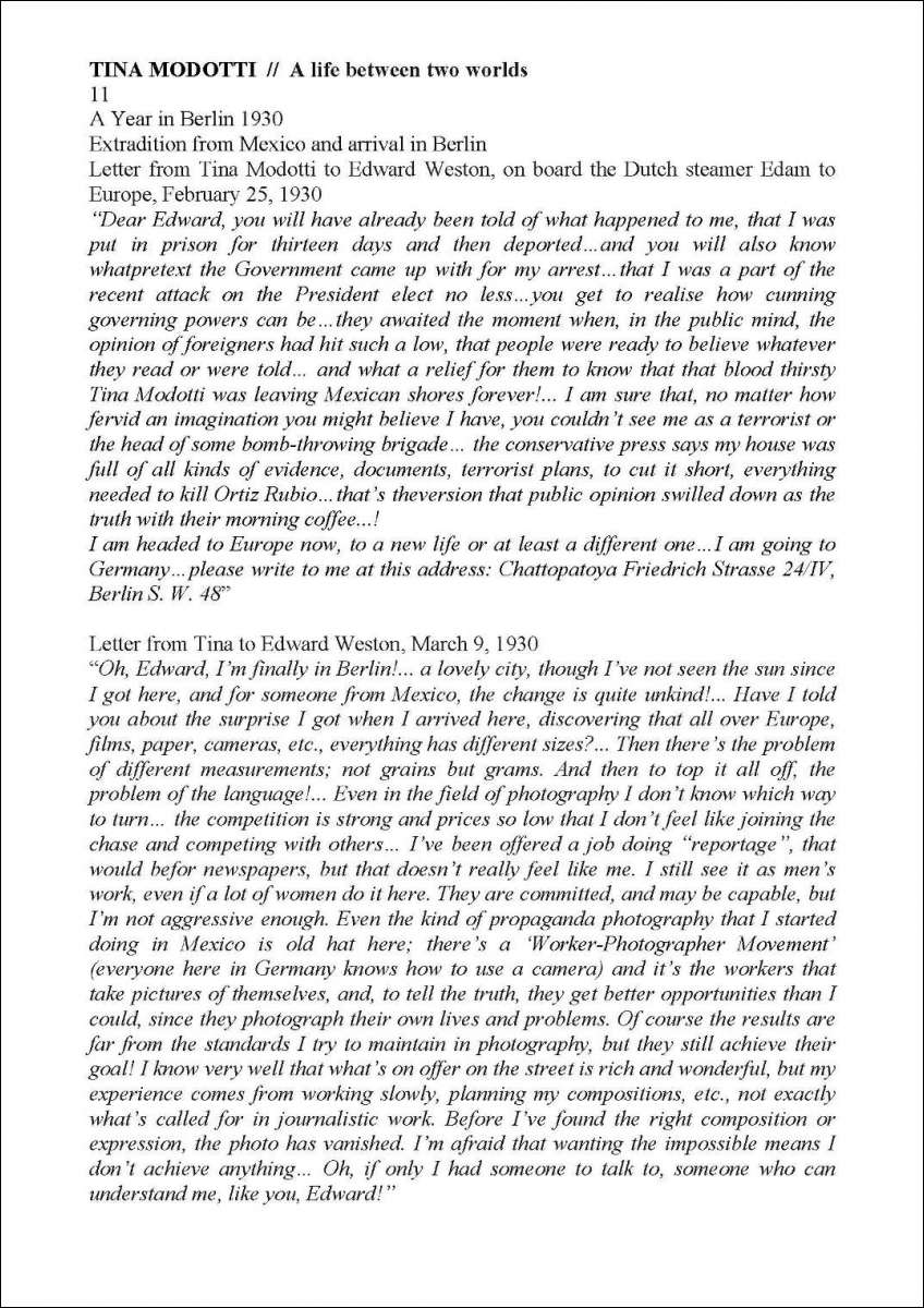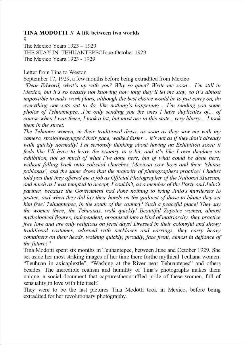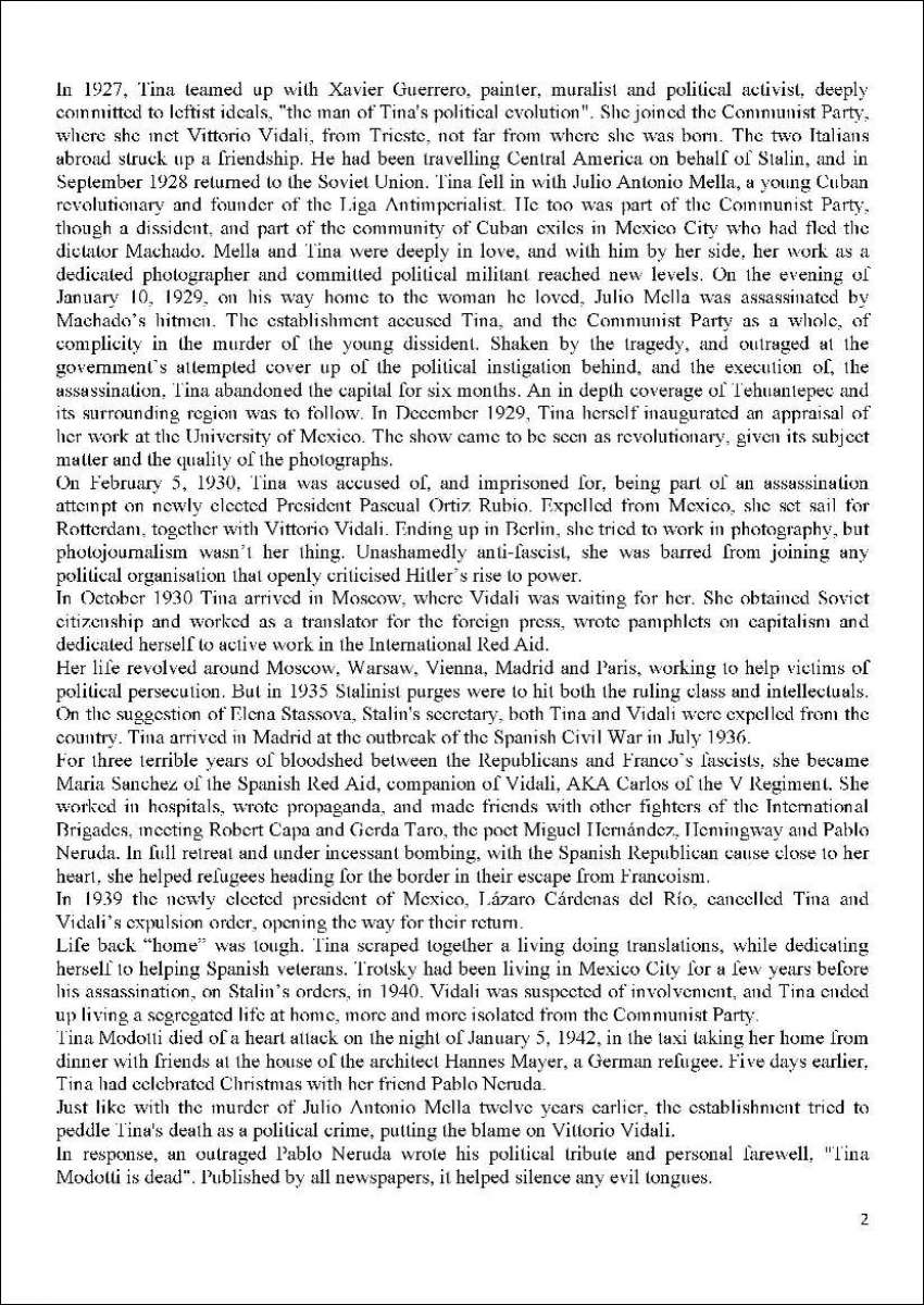 Completano la mostra anche numerosi documenti che contribuiscono a illustrare le vicende umane e politiche di Tina Modotti dell’ultima fase, quale componente del Partito Comunista, nonché Dirigente delle Brigate Internazionali del Soccorso Rosso, fino alla morte, avvenuta a Città del Messico nel 1942 a soli 45 anni.