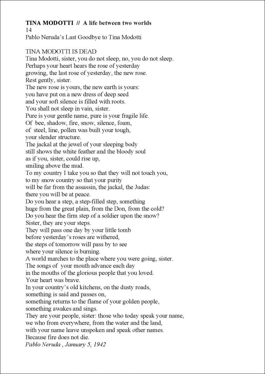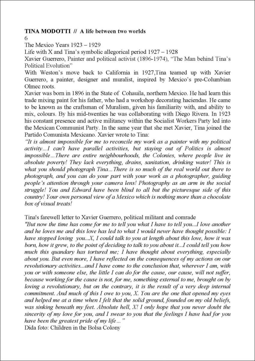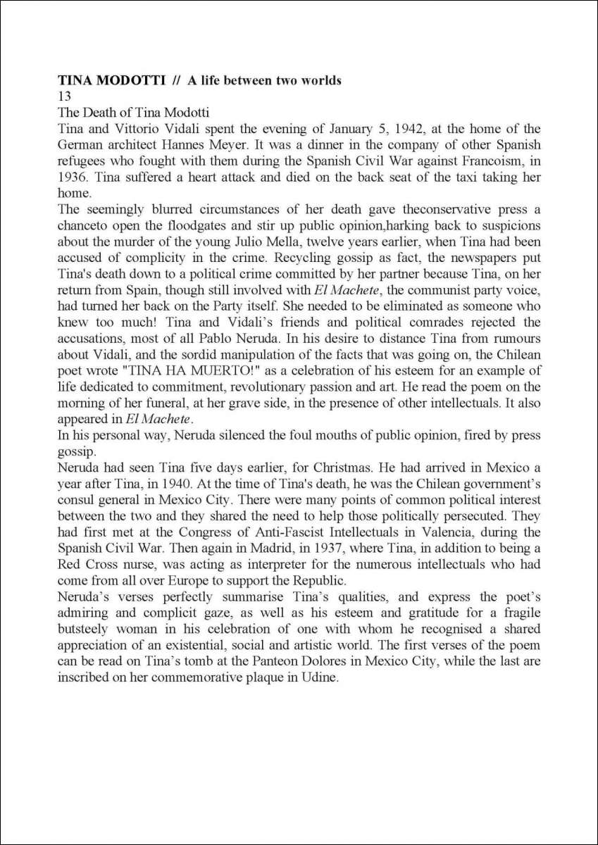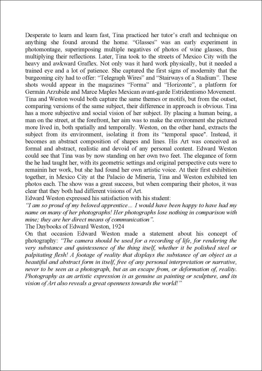Completano la mostra anche numerosi documenti che contribuiscono a illustrare le vicende umane e politiche di Tina Modotti dell’ultima fase, quale componente del Partito Comunista, nonché Dirigente delle Brigate Internazionali del Soccorso Rosso, fino alla morte, avvenuta a Città del Messico nel 1942 a soli 45 anni.